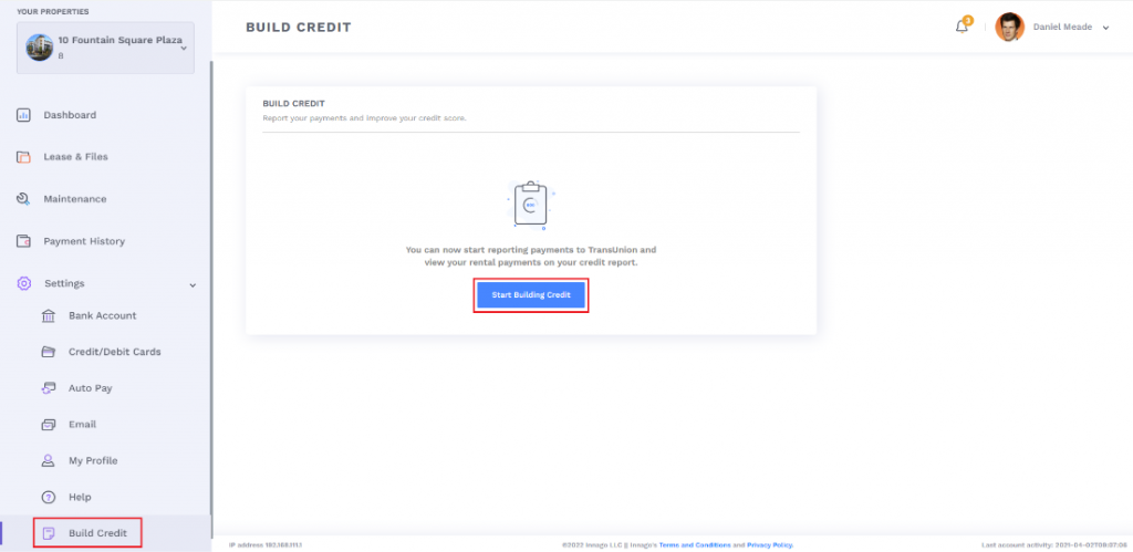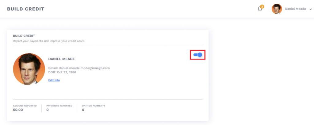 • Innago begins reporting rent payments only after a tenant turns on the ‘Build Credit’ feature. This means that no past payments are reported to TransUnion.